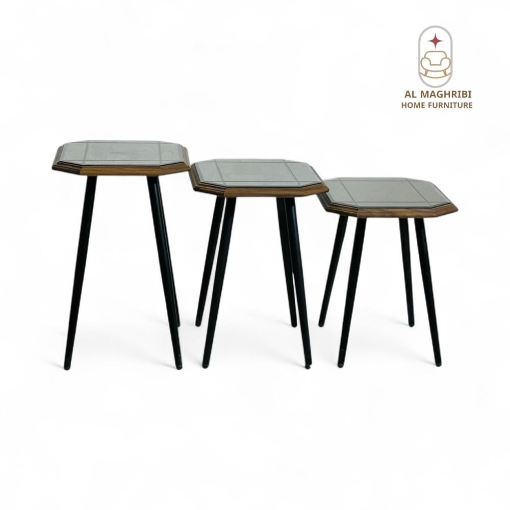 مكوّن من ثلاث قطع مصنوعة من الخشب باللون البني العصري، يتميز بتصميمه البسيط والمتناسق الذي يضيف لمسة جمالية للمكان. يمكن استخدام الطاولات معًا بشكل متكامل أو توزيعها بشكل منفصل لتلبية مختلف الاحتياجات.
