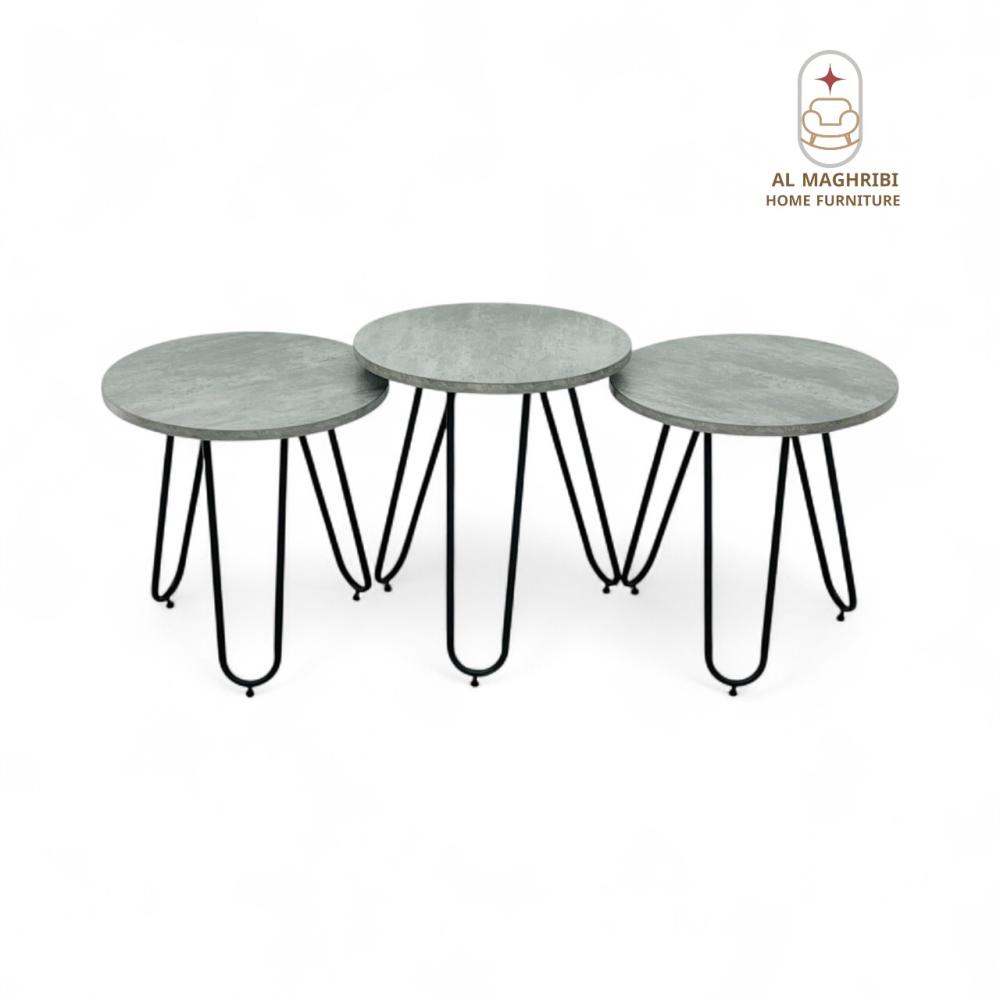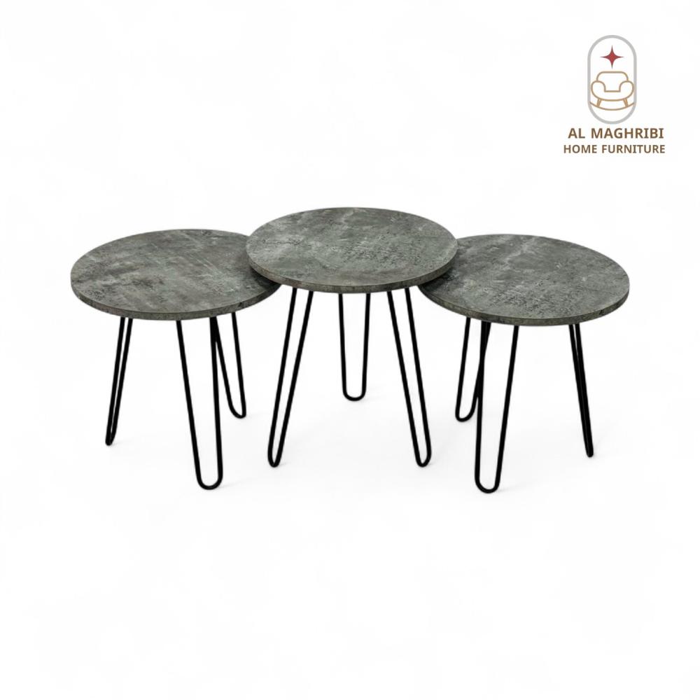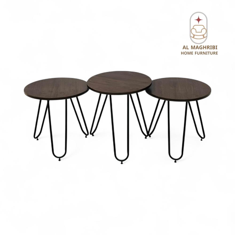 مكوّن من ثلاث قطع مصنوعة من الخشب باللون البني العصري، يتميز بتصميمه البسيط والمتناسق الذي يضيف لمسة جمالية للمكان. يمكن استخدام الطاولات معًا بشكل متكامل أو توزيعها بشكل منفصل لتلبية مختلف الاحتياجات.
