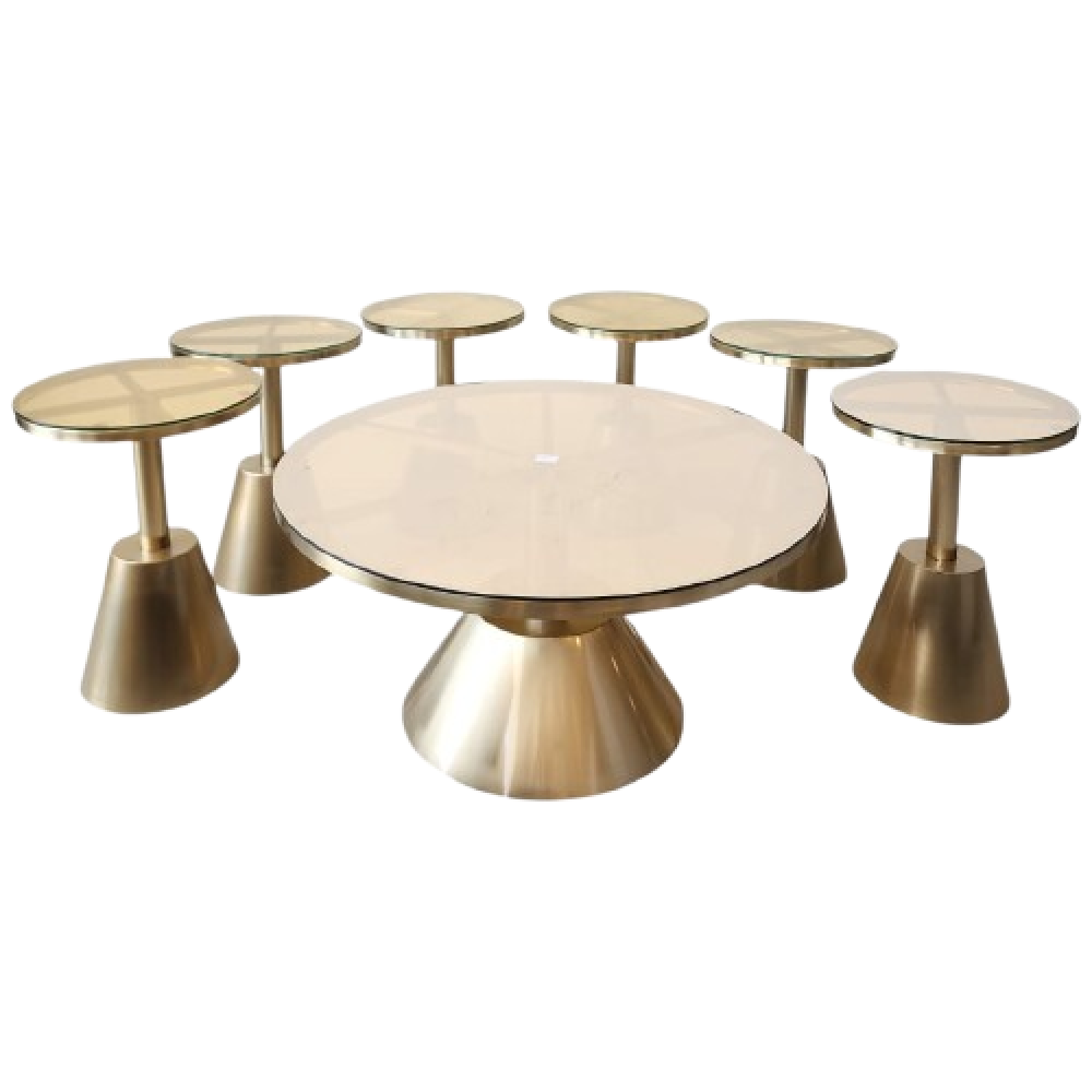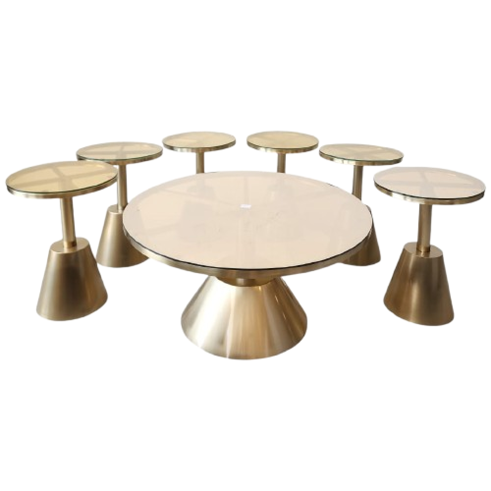 طقم أنيق مكوّن من طاولة رئيسية واحدة و6 طاولات جانبية، يتميز بتصميم عصري وانسيابي يجمع بين البساطة والفخامة. يأتي بسطح زجاجي دائري أنيق بلمعة راقية تضيف لمسة عصرية لأي مساحة.