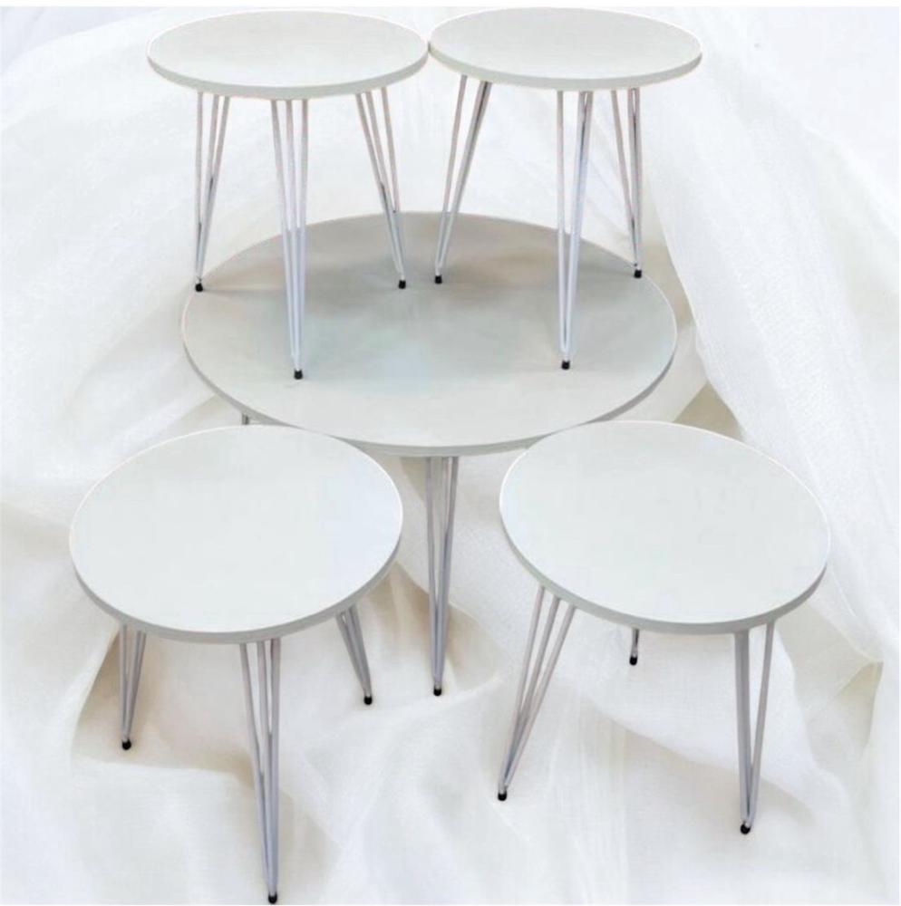 الطاولة الرئيسية تصميمها دائري خش فورمايكا وكذلك الطاولات الجانبية متوفرة بــ 4 ألوان ( البيج ــ البني الخشبي ــ الأبيض ــ الأسود )